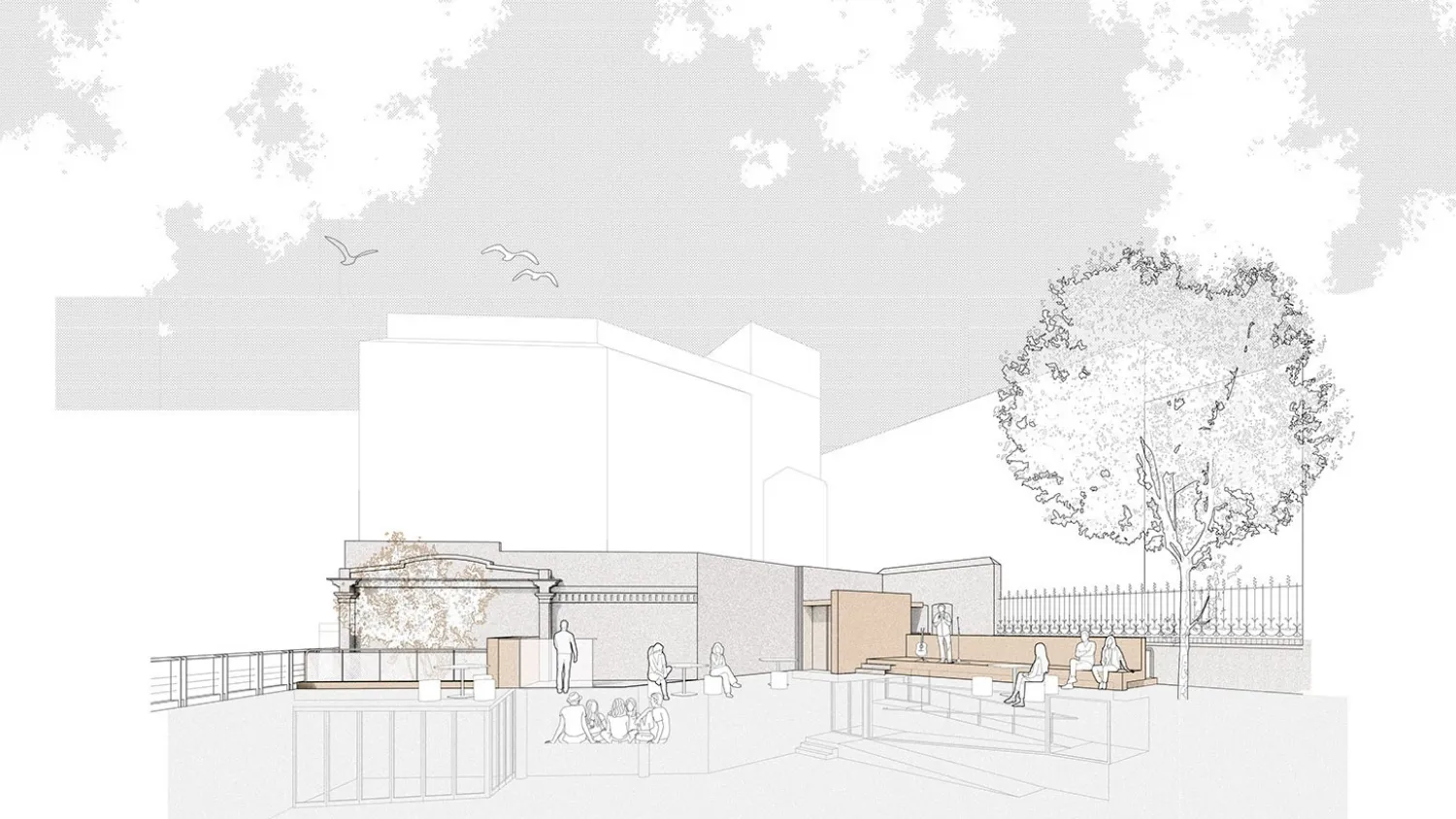 La propuesta quiere preservar el patio actual y sus visuales, considerando importante respetar el patrimonio a la vegada que se quiere lograr el objetivo de hacer accesible el nivel del actual sótano de la Casa Lluvià. Se trate de proyectar dos vacíos y provocar un pliego al pavimento, permitiendo abrir el sótano en la ciudad, al aire y a la luz.